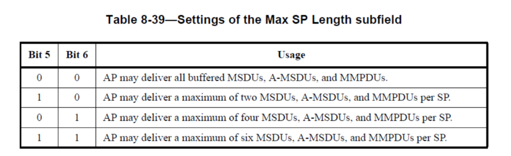 1. Suppose STA sets “Maximum service period length” as 10(one zero) in Association Request. So according to below table AP may send max 2 Data frame to STA within one service period.
