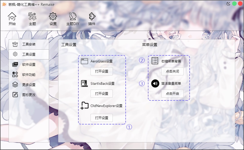 ◆ 工具设置: 打开美化软件设置菜单、开启右键菜单背景、简洁音量菜单等功能