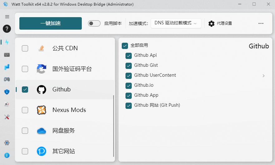 1.在微软应用商店搜索并安装Watt Toolkit(原来的名字是Steam++现在更名了),安装好后打开勾选Github进行网络加速(软件安装后需要联网另外下载一些文件,网络原因可能下载比较慢或者下载不了所以需要Watt Toolkit进行加速);