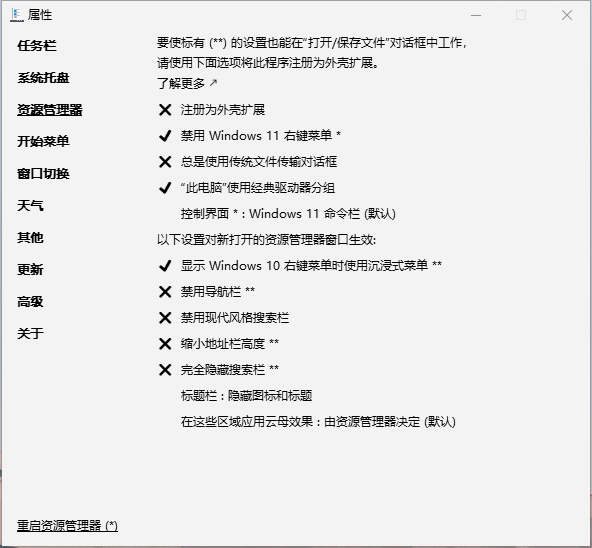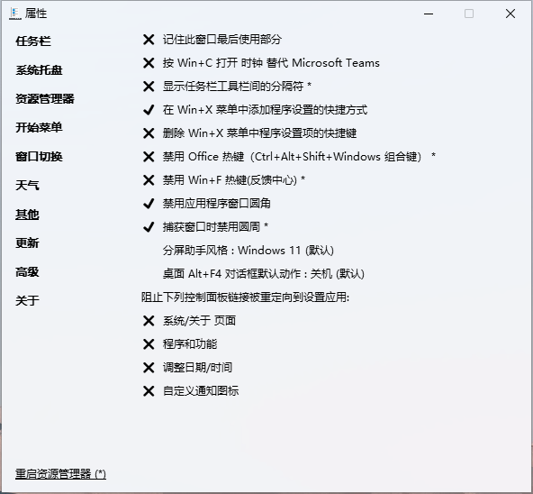 功能比较相近的软件搭配使用的话部分功能设置可能会有冲突,首先不建议搭配StartAllBack、Stardock Start11等软件使用,有必要时建议创建还原点能有效撤销不必要的更改。
