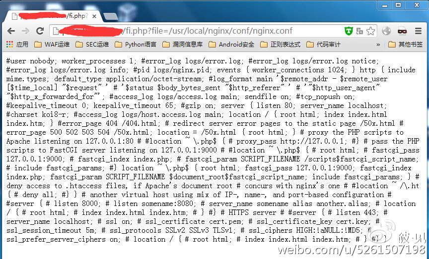 - 对于绝对路径文件包含,WAF一般会拦截常见路径,而不会防御所有的绝对路径。因此,在渗透测试中,可以包含其他的路径下一些文件,例如/usr/local/nginx/conf/nginx.conf。
