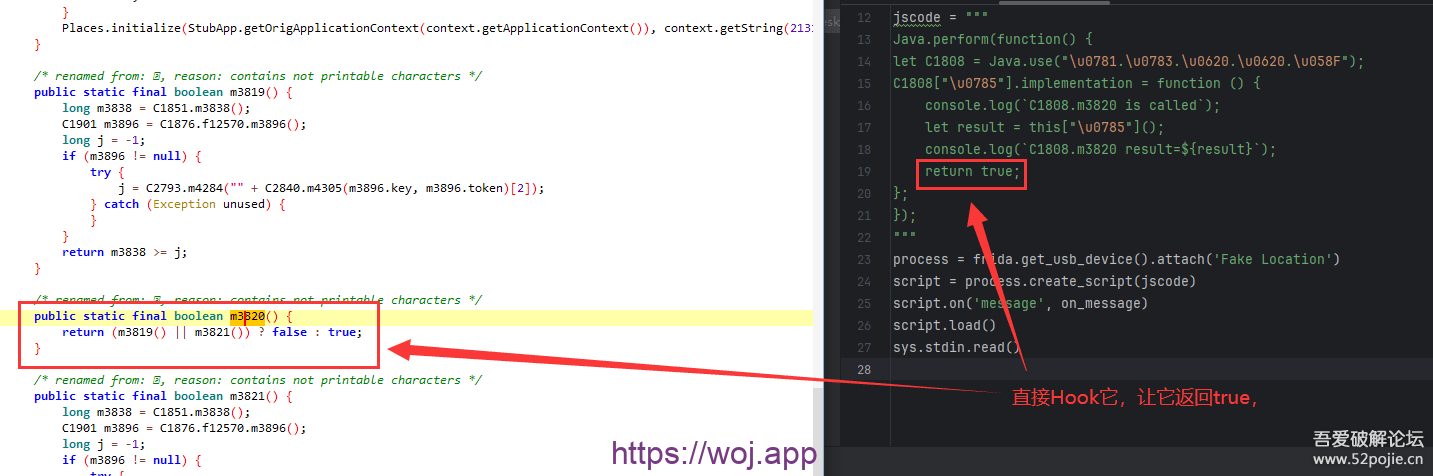 9.我们直接双击m3820追上该方法,直接hook它让它返回true,这样"!C1808.m3820()"就会为假,就能跳过m4095