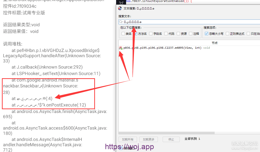 4.直接hook该方法,发现确实被调用,而且第一个参数就是“试用专业版”,仔细观察代码,就会发现这是一个配置按钮的方法