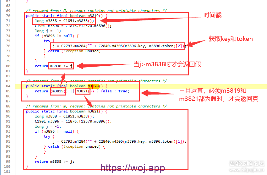 11.我们回到代码查看;j最终是要跟m3838这个时间戳比较,那么j肯定是要被解密后才能去跟一个时间戳作比较,而m4305就是解密的关键
