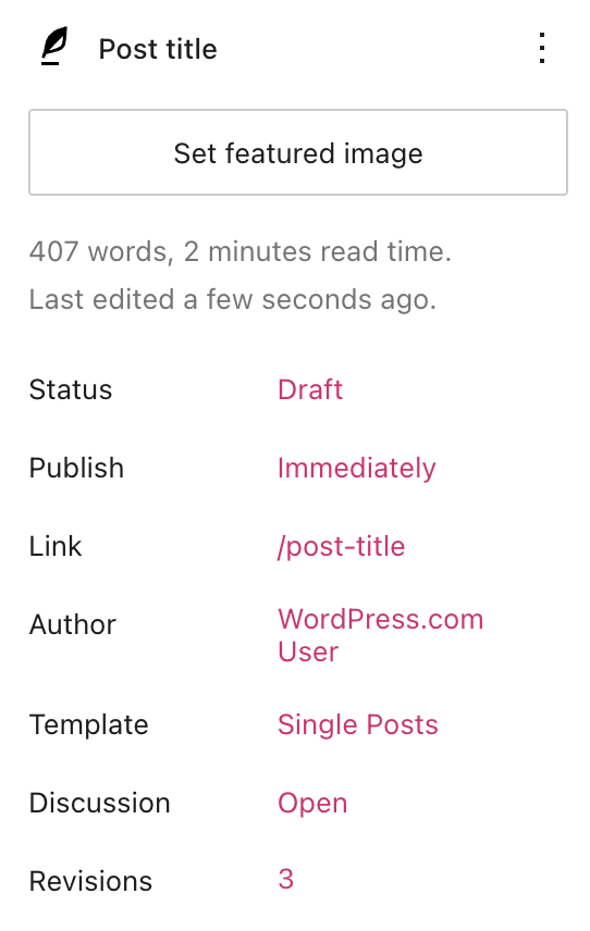 Abaixo da opção de imagem destacada, você encontrará o número de palavras do post, além do tempo de leitura estimado e da data da última edição do conteúdo.