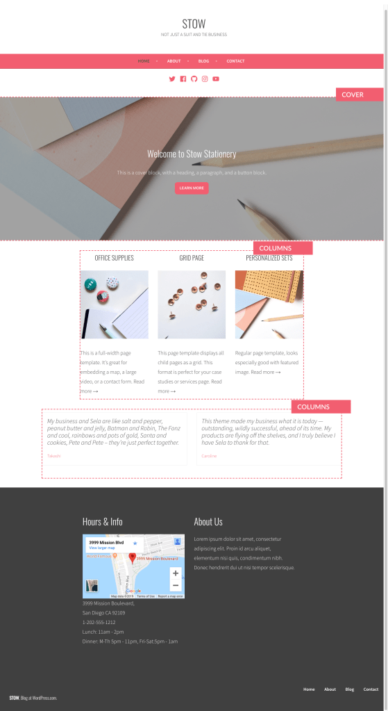 Stow fully supports the new WordPress Editor. You can choose any of the available blocks to create a wide range of content for your site. Here’s how we built the homepage on the demo site, block by block: