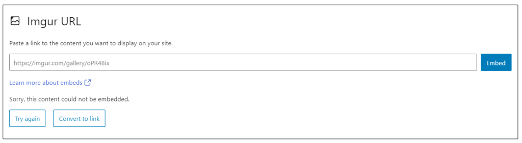If you use a URL that can’t be embedded, the block shows the message “Sorry, this content could not be embedded.” You will have two choices: Try again with a different URL or convert to a link.