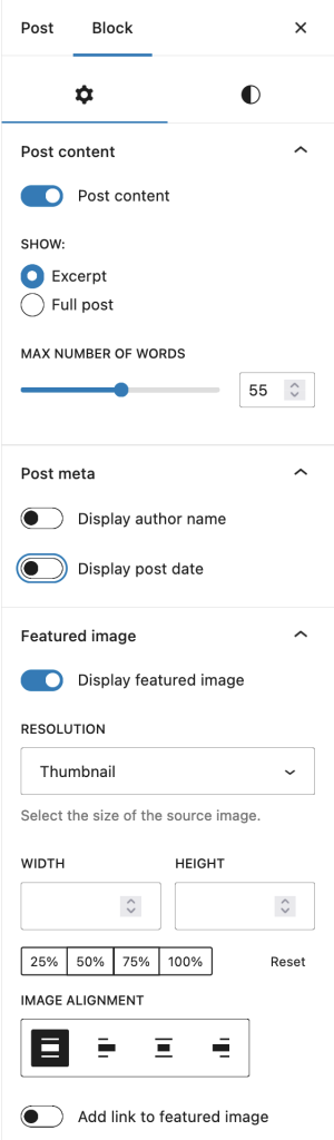- Full width – Extend the Latest Post block to cover the full width of the screen