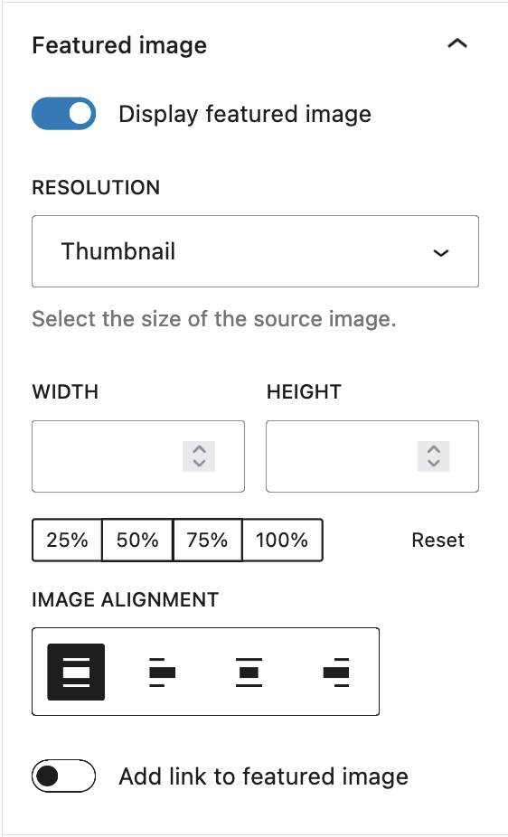 With Featured image settings you can select resolution, dimensions, alignment and whether you want image to link to the article itself.