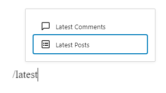 The latest posts block can be added to a page by clicking on the Add Block button. It can be found in Widgets section. Alternatively, you can type /latest and click on Latest Posts.