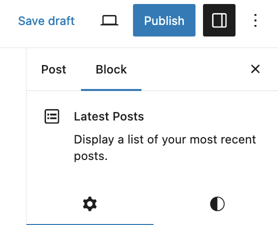 Every block has specific options in the editor sidebar in addition to the options found in the block toolbar. If you do not see the sidebar, simply click the ‘cog’ icon next to the Publish button.