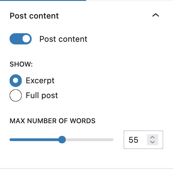 You can choose to show full post content or post excerpt with the option to modify the number of words for the excerpt.