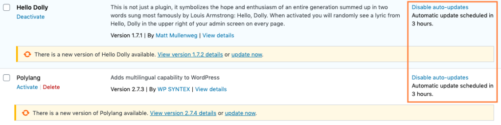 Plugins auto-updates can be bulk enabled or disabled for several plugin at one time by using the bulk action selector. Select plugins using the checkbox located in the first column of the plugins list table and use the bulk action selector located on the top of the table to enable or disable auto-updates. Then click on the “Apply” button to bulk enable/disable auto-updates for the selected items.