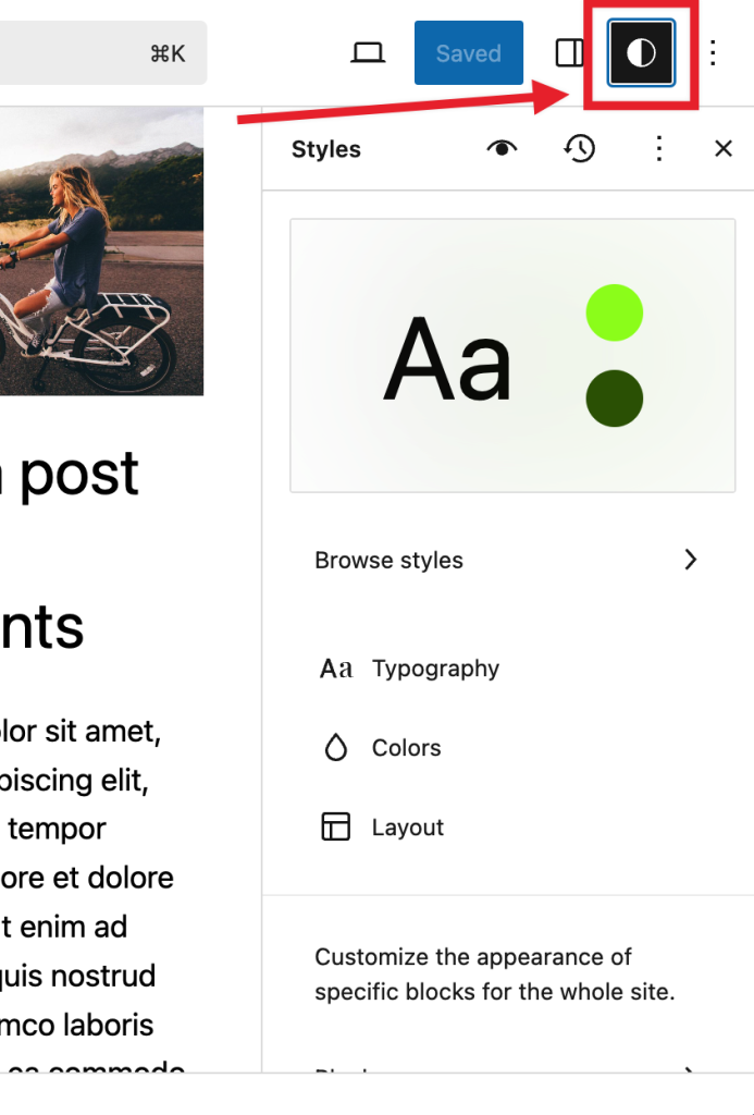 - Click the Styles menu item or on the icon next to the block settings sidebar.