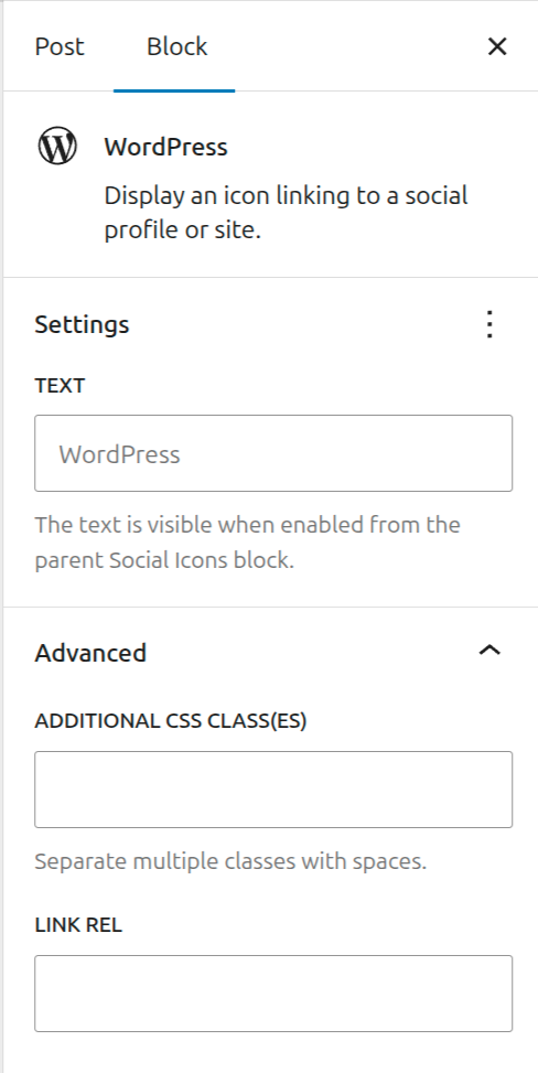 When you select the Social Icons block, you will see the following settings in the sidebar.