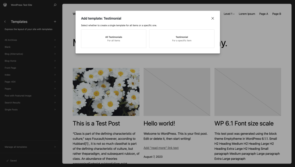 For eg: to create a custom archive template for a specific custom post type eg: Testimonial, select Archive: Testimonial from the drop-down menu, after you choose to add a new template. This will open the Template Editor pre-populated with the content of the Custom Post Type. This means you would be presented with content already in the template rather than starting from scratch. You can design the layout further by adding or removing blocks from the template.