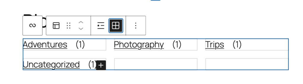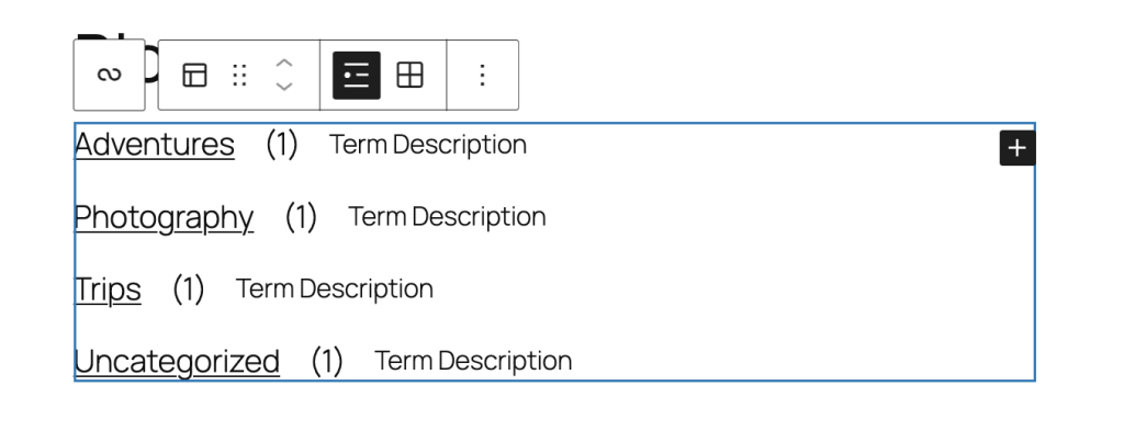 The Terms Query block displays a list or grid of taxonomy terms (such as Categories, Tags, or custom taxonomies). It’s most useful in templates (for example, a “Categories” index or a directory page) where you want to list terms and design how each term appears.