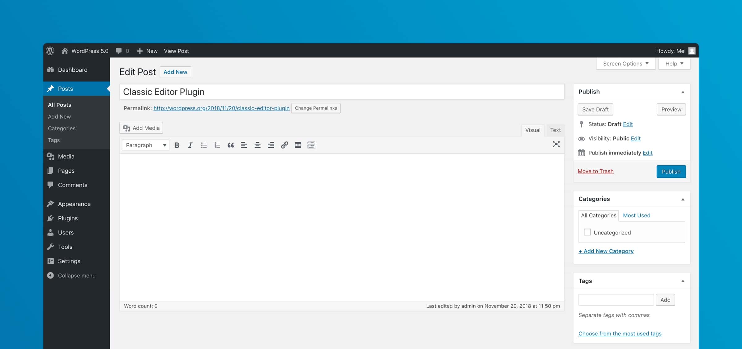 The Classic Editor plugin restores the previous WordPress editor and the Edit Post screen. It lets you keep using plugins that extend it, add old-style meta boxes, or otherwise depend on the previous editor. To install, visit your plugins page and click the “Install Now” button next to “Classic Editor”. After the plugin finishes installing, click “Activate”. That’s it!