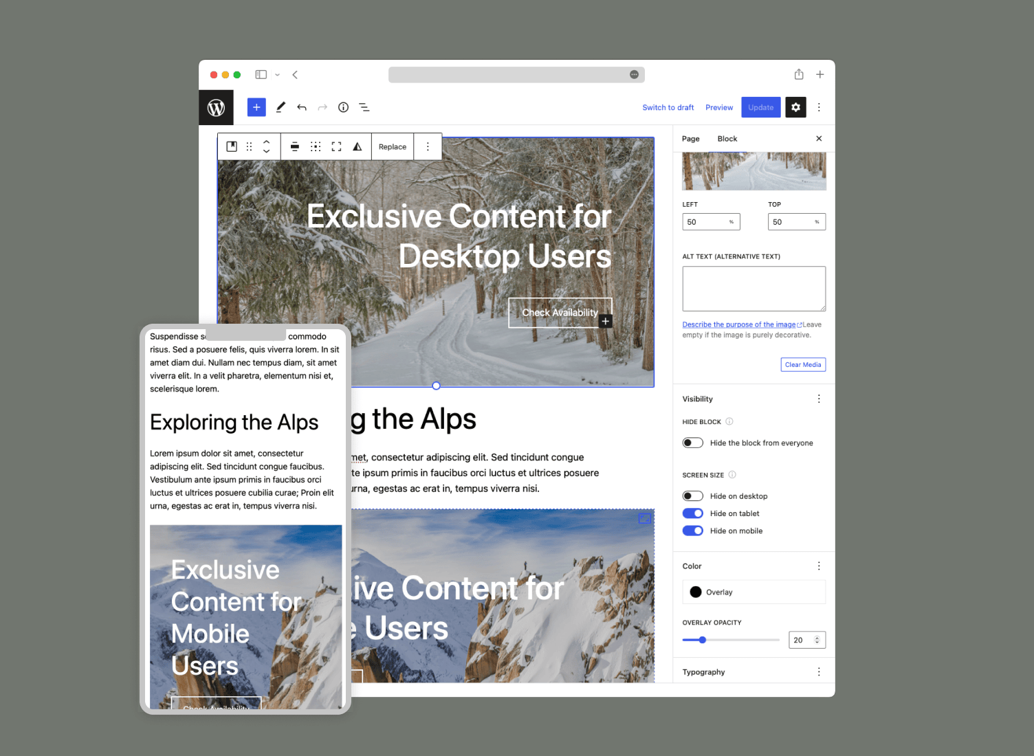 - Show or hide specific content on desktops, tablets, or mobile devices.