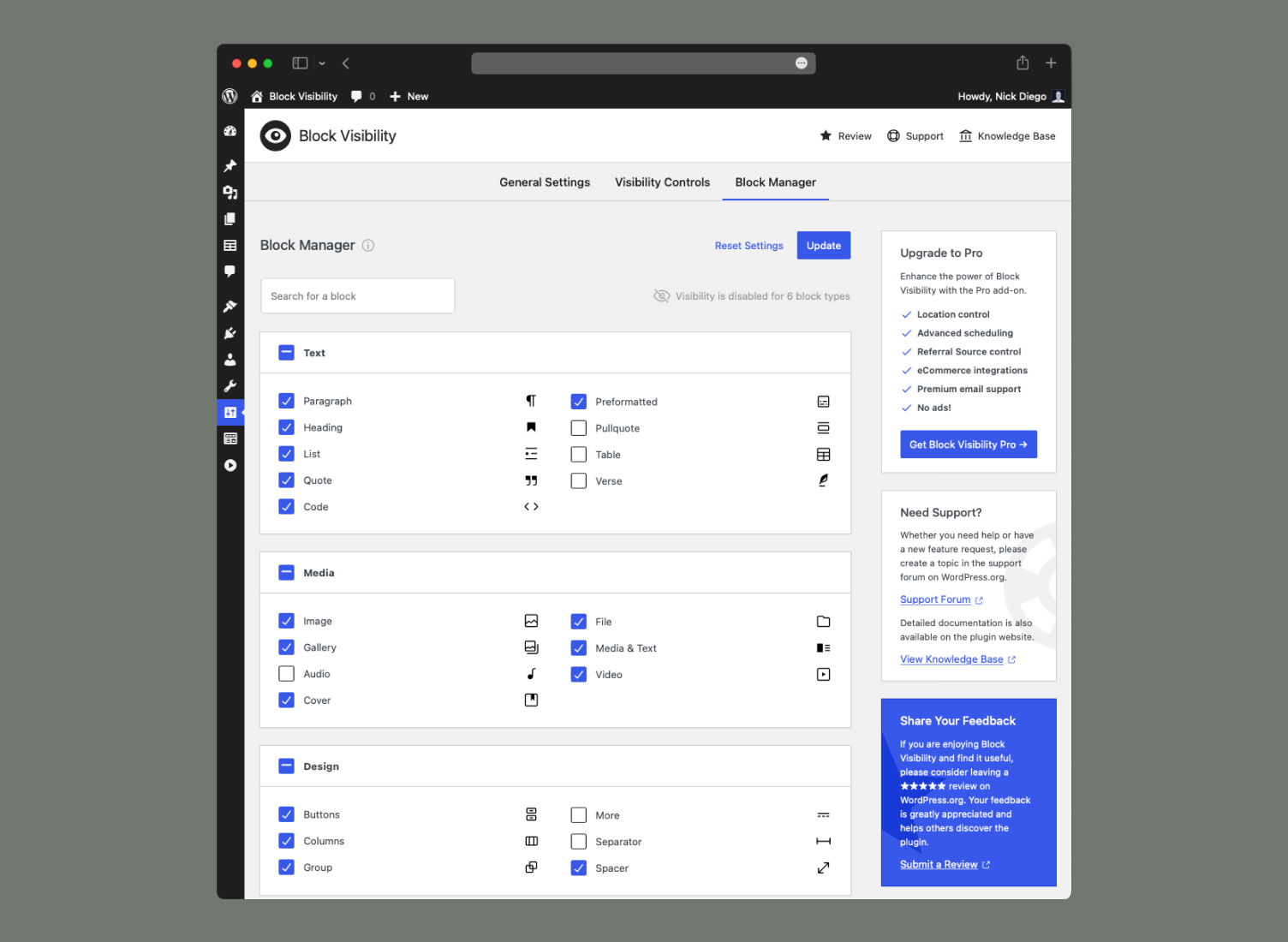 Block Visibility is designed, developed, and supported by Nick Diego with contributions from the broader Block Visibility community. Have an idea for additional block logic? Let us know in the plugin support forum.