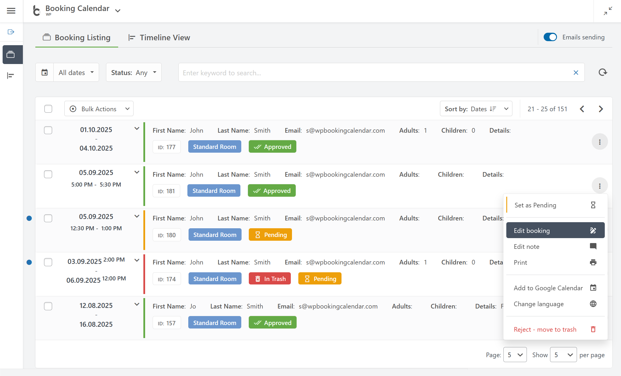 - Improvement: Improvement of consistent menu items in Bulk Actions menu and in the booking “Action menu”. Pending / Trash / Restore / Delete options has the same color and same opening popup dialog. (10.11.4.1)