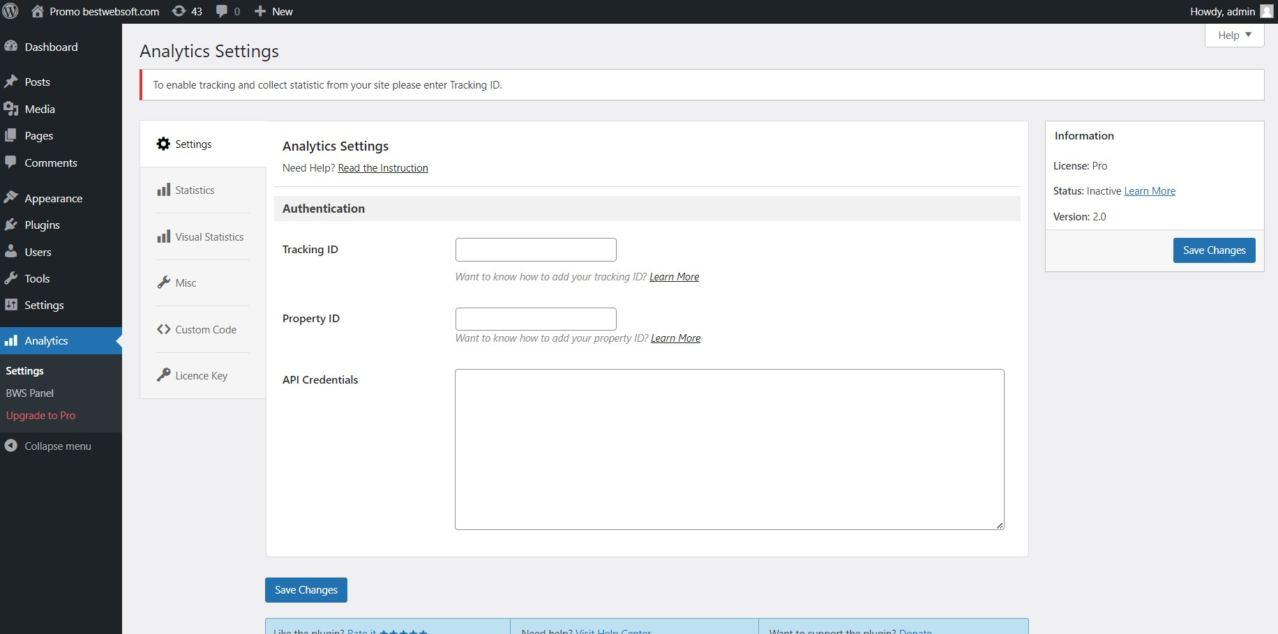 bws-google-analyticsfolder to the/wp-content/plugins/directory. - Activate the plugin using the ‘Plugins’ menu in your WordPress admin panel.