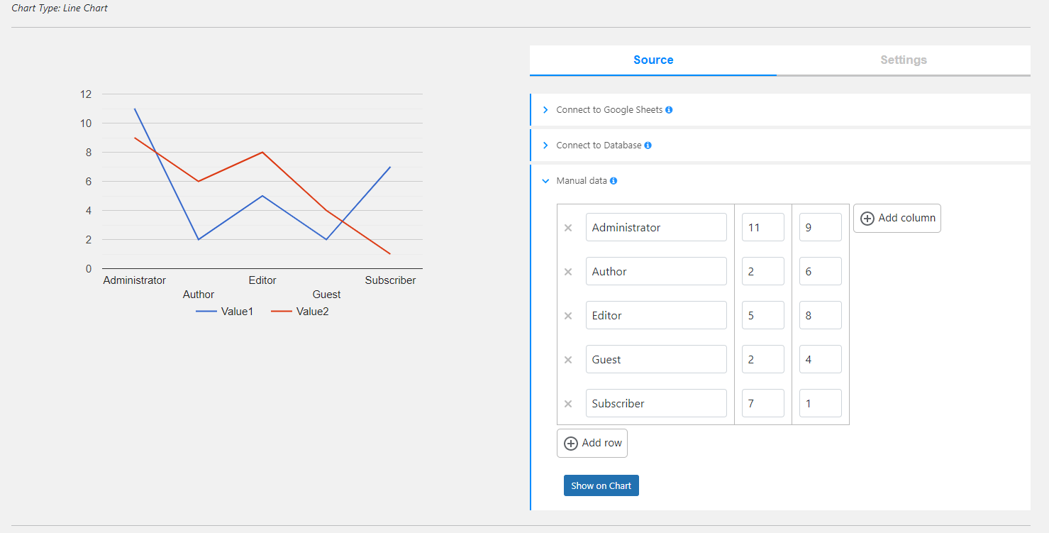WordPress Chart Plugin is designed to build both static and dynamic charts, graphs and diagrams for your WordPress website. Interactive Charts WordPress can display in three methods: manually inputting data, linking to your Google Spreadsheet, or querying your preferred database.