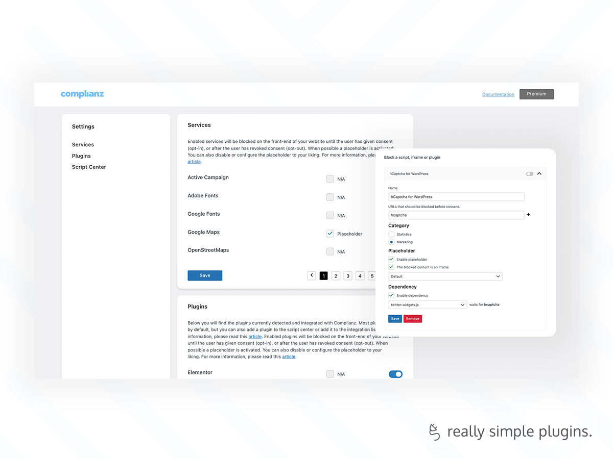 • Script Center to control scripts, iFrames and plugins per category or service. With dependency functionality and placeholders.