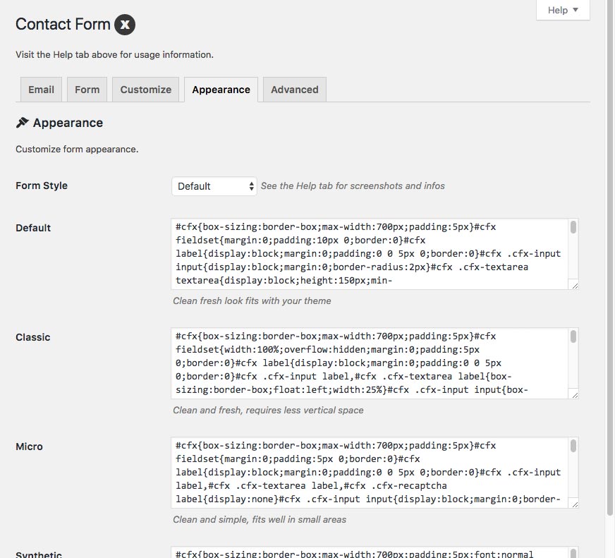 The last two themes (Synthetic, Dark) go much further with the stylings. The Synthetic and Dark styles will override any/most CSS applied via your WordPress theme. So if the contact form looks weird or whatever when trying Default, Classic, or Micro, try either Synthetic or Dark should do the trick.