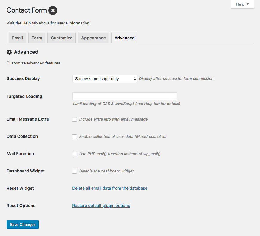 Some sites prefer to have a “Contact” page, and then just display the contact form in one location. In this scenario, it doesn’t make sense to include plugin assets on every front-end page. So CFX provides a setting called “Targeted Loading” (under the Advanced tab). There you can enter the URL of the page that displays the contact form. That way, the plugin will know to load assets only on that page. This is an excellent way to help keep things optimized for performance and so forth.