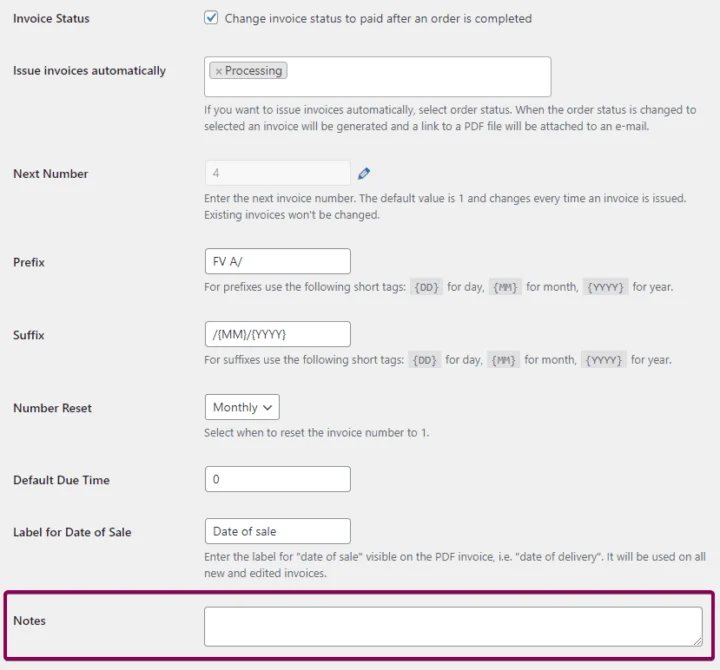 PRO version automates issuing WooCommerce PDF invoices. The plugin lets you create three types of documents – invoice, proforma, and correction invoice. If you need more info on your WooCommerce invoice, you may add additional notes as well.