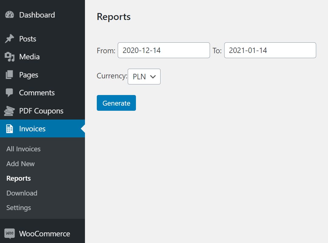 - Generate and download WooCommerce invoices in bulk by a date range,