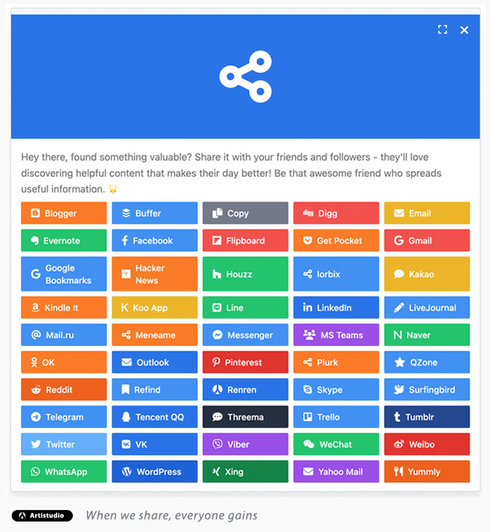 - Social Sharing Add beautiful social share buttons to your content. Boost engagement and make it easy for visitors to share your posts across social media platforms.