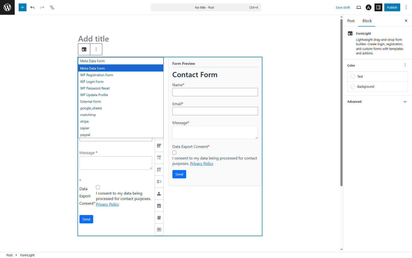 4. Add the FormLight block to any page or post in the Gutenberg editor to create your form