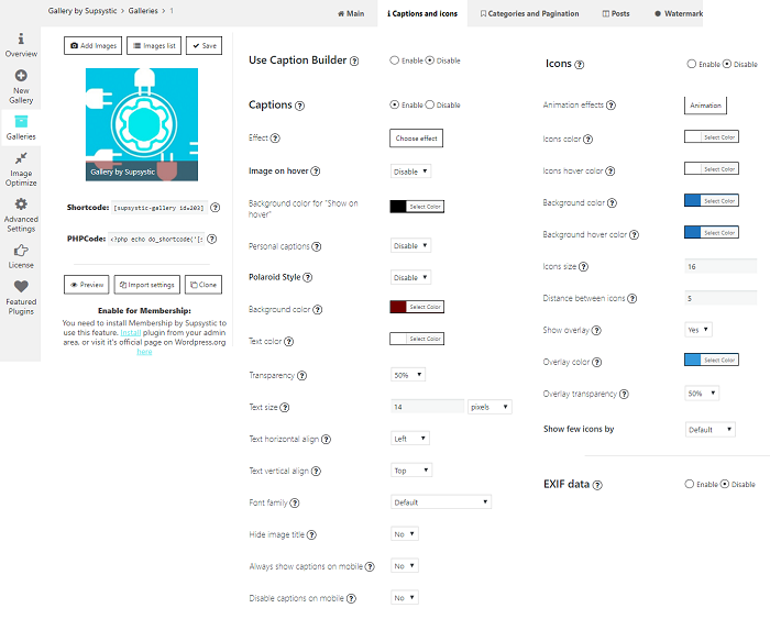 Photo gallery plugin admin area. Captions and Icons tab. Create impressive gallery with icons and fantastic caption effect.