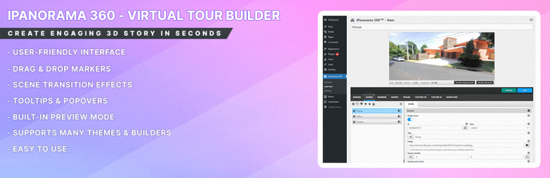 iPanorama 360 is the WordPress plugin out there that lets you create excellent virtual tours for clients from directly inside the WordPress admin in seconds. The plugin supports markers for providing information about any part of the scene or for navigation to other rooms/areas. With a well-builded tooltip system, you can enrich a scene with text, images, video, and other online media resources. Use this plugin to create interactive & virtual tours, maps, presentations.