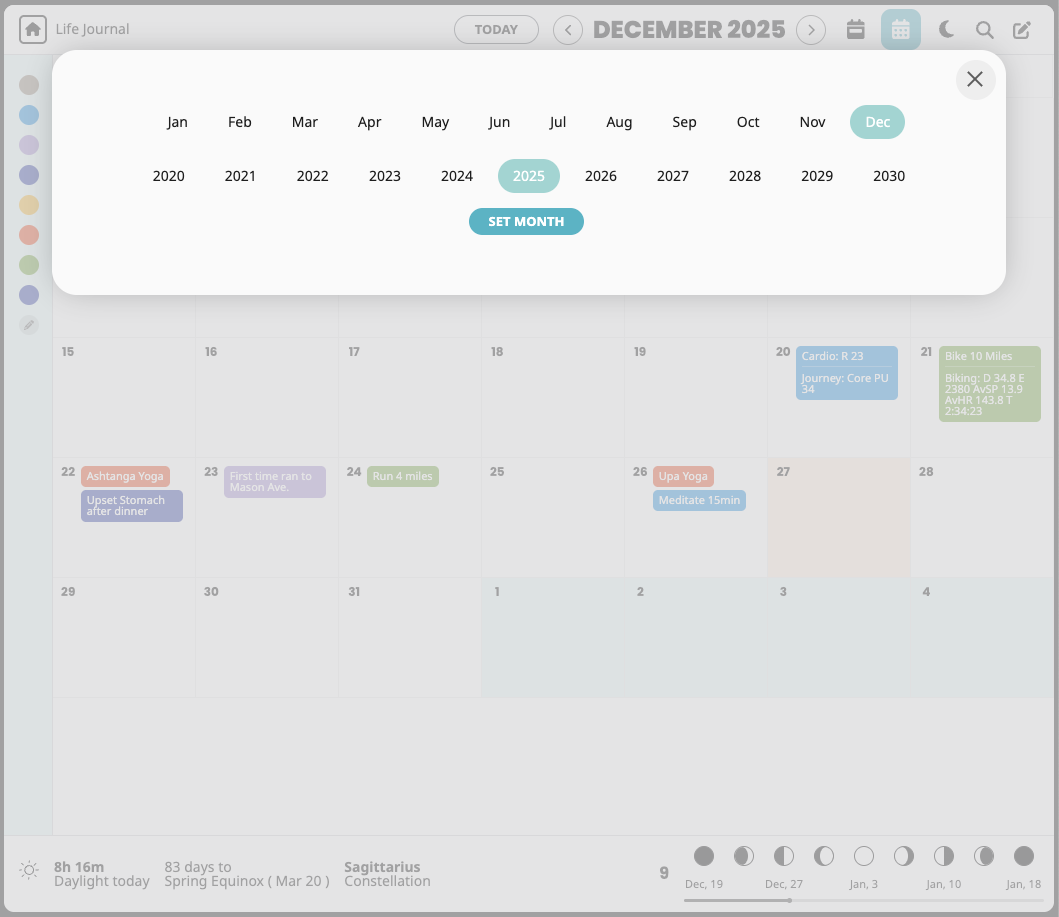 Switch from the standard calendar to a moon-phase (lunisolar) view and align your journaling with natural rhythms.