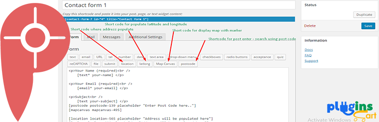 Contact form 7 shortcode code to add map, longitute, latitude and address fields on contact form.