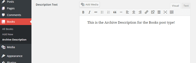 The editing interface for writing a post type archive description. This plugin adds the “Archive Description” link in the left menu, the “View Books Archive” link in the admin bar, and, of course, the field to save the description.