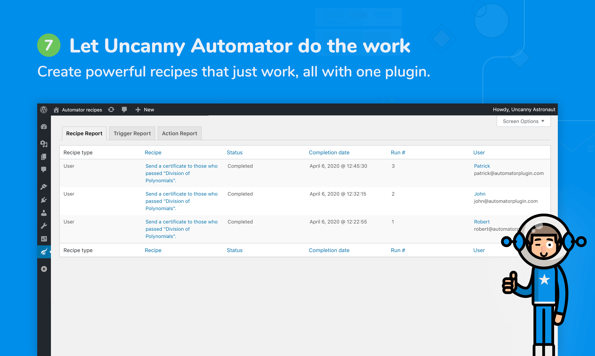 Uncanny Automator is the easiest and most powerful way to automate your WordPress site with no code. Build automations in minutes that connect your WordPress plugins, sites and apps together using billions of recipe combinations.