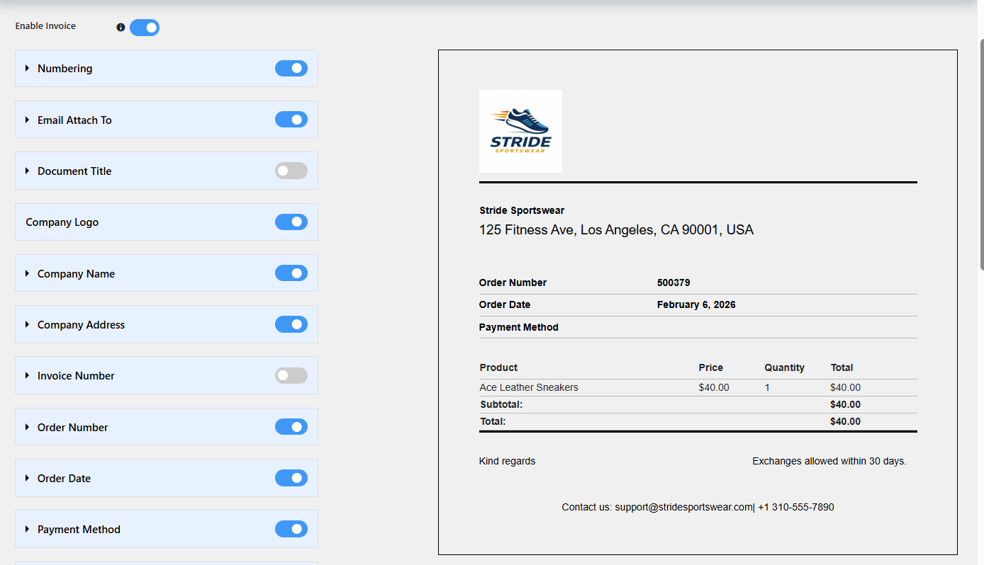 - Customize invoice numbering with prefix and suffix