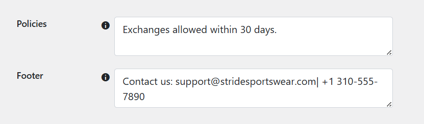- Footer text, policies, and customer notes