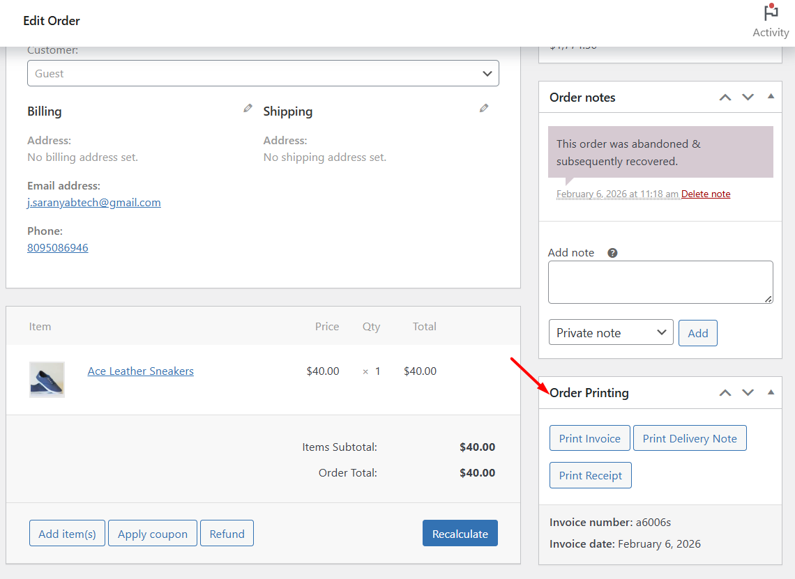 - Provides print options for invoices, delivery notes, and receipts directly from the WooCommerce Orders page