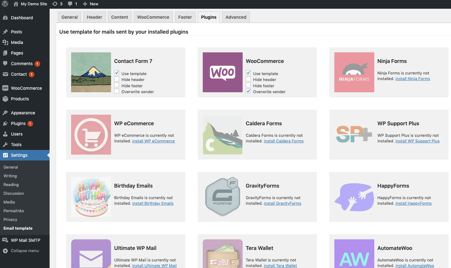 Different plugins send different emails but you can define global color and font settings for headlines, text, links and more to give all your emails a common professional look. - Add your companies legal information to the footer:
