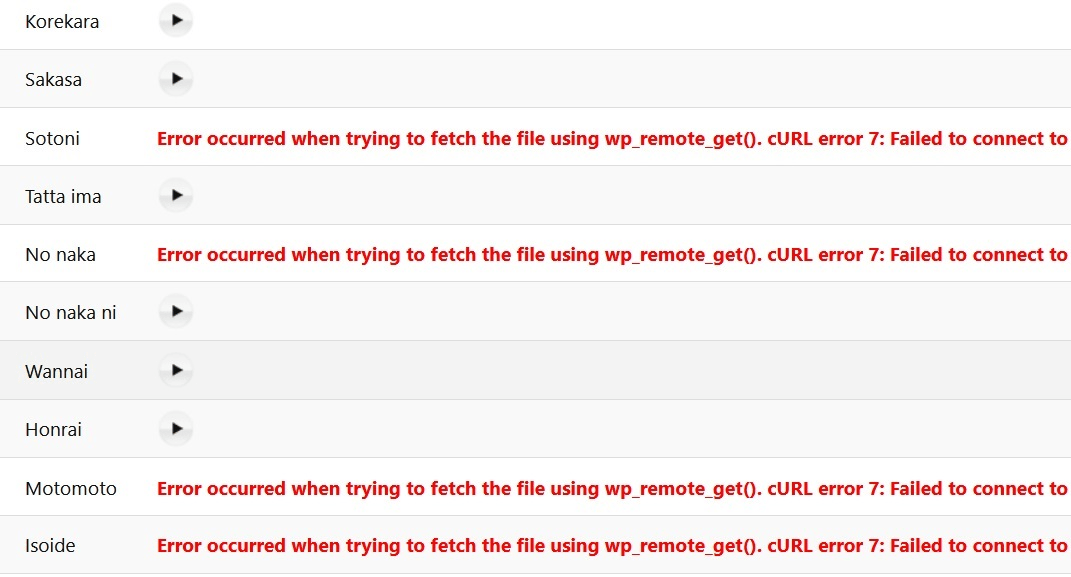Some audio has this error:Error occurred when trying to fetch the file using wp_remote_get(). cURL error 7: Failed to connect to [my website] port 443: Connection refused.