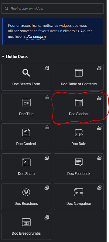 as you can see, the block “Doc sidebar” doesn’t exist in the “BetterDocs” catégories, it only show when you search it in the search bar