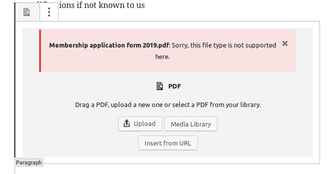 I can upload the exact same file to media library first, and then browse to it via the Media Library button in the bloc, and that works fine, but annoying to have to do another step so will try out some other PDF embed plugins to see if they just work…