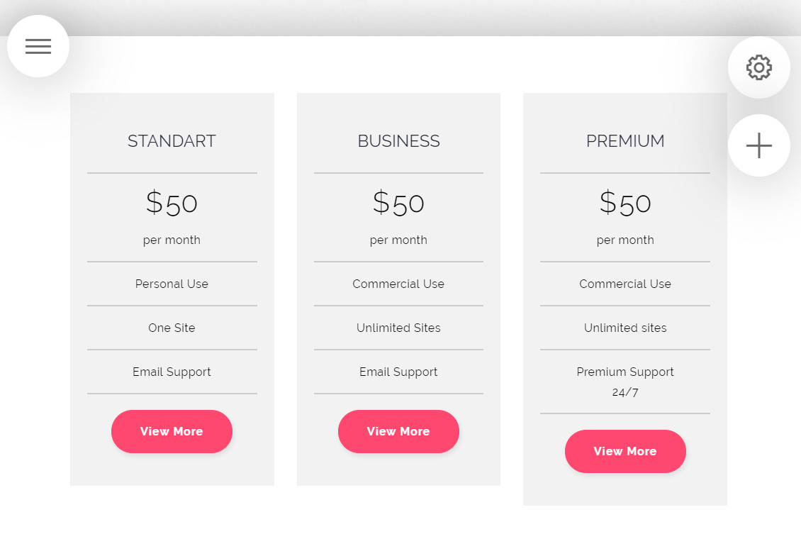 Each section comes with their own settings you need to design their appearance. Let’s take look at the pricing table as example. Initially, the section shows us 3 grey tables with white background.