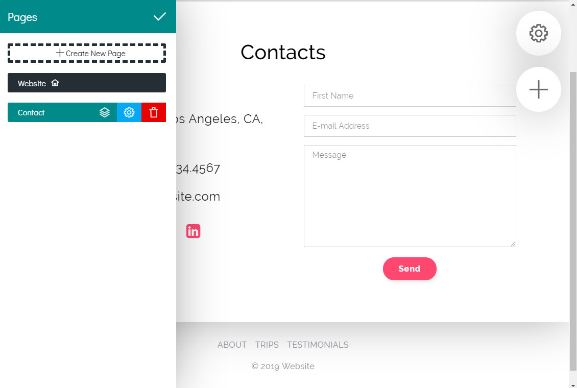 By going to the menu to the left, you find global settings. It’s related to text fonts and button/link colors. Moreover, here you manage the structure of your website by adding more pages - in this picture you see the pages of a project example that consists of a start page and a contact page.