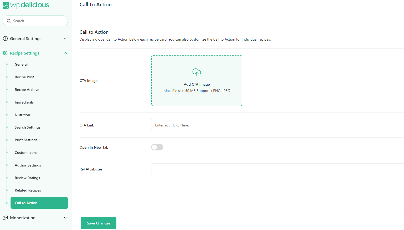 You can add the Global CTA section to every recipe card. Please navigate to WP Delicious Settings > Recipe Settings > Call to Action.